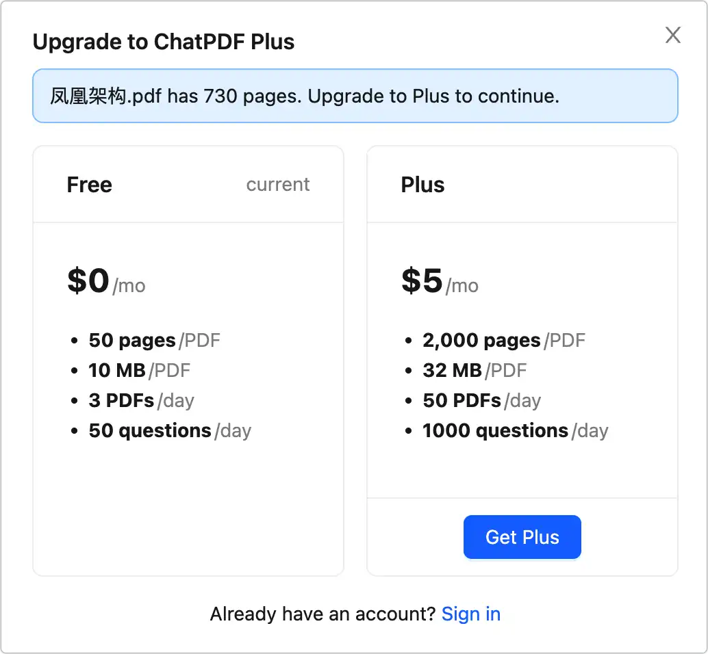 可以分析 PDF 文件的内容,提取内容,通过问答的方式对 PDF 内容进行学习,不过免费版有一些限制: