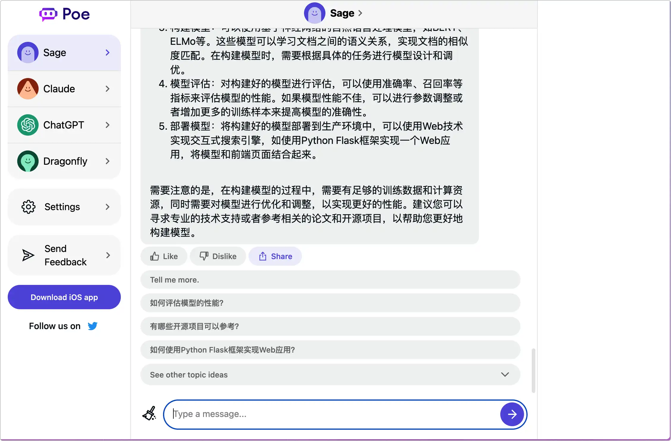 Poe 内置了 Sage、Claude、Dragonfly、和 ChatGPT 。其中,Sage 是基于 ChatGPT 简化版本的 AI 机器人。目前 Poe 移动端只支持 iOS,而且是非国区的,不过网页版可以用。