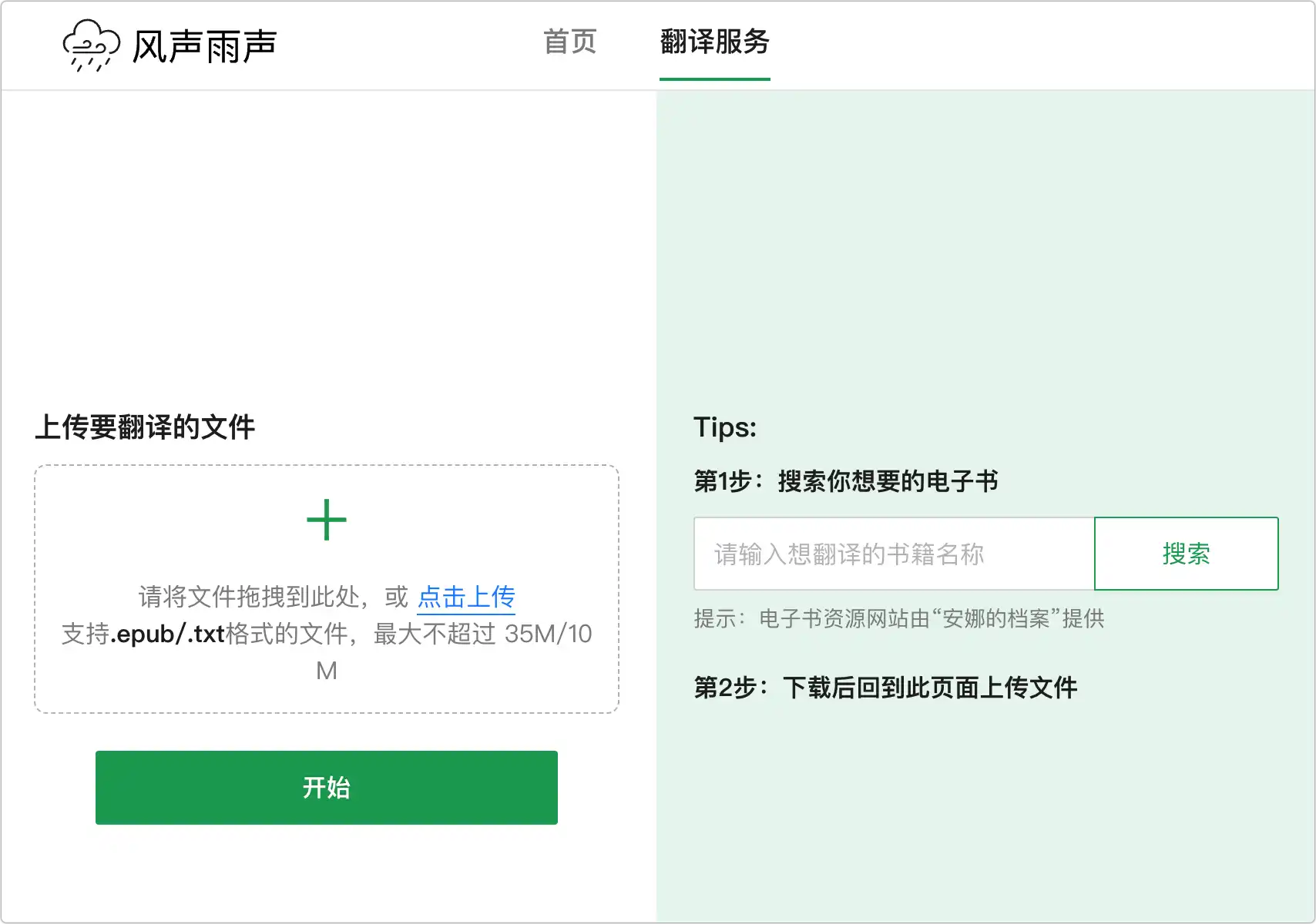 可以对 epub 、txt 书籍进行翻译,亮点是提供书籍搜索功能,下载好书籍后,将书籍上传到系统,点击开始即可。
