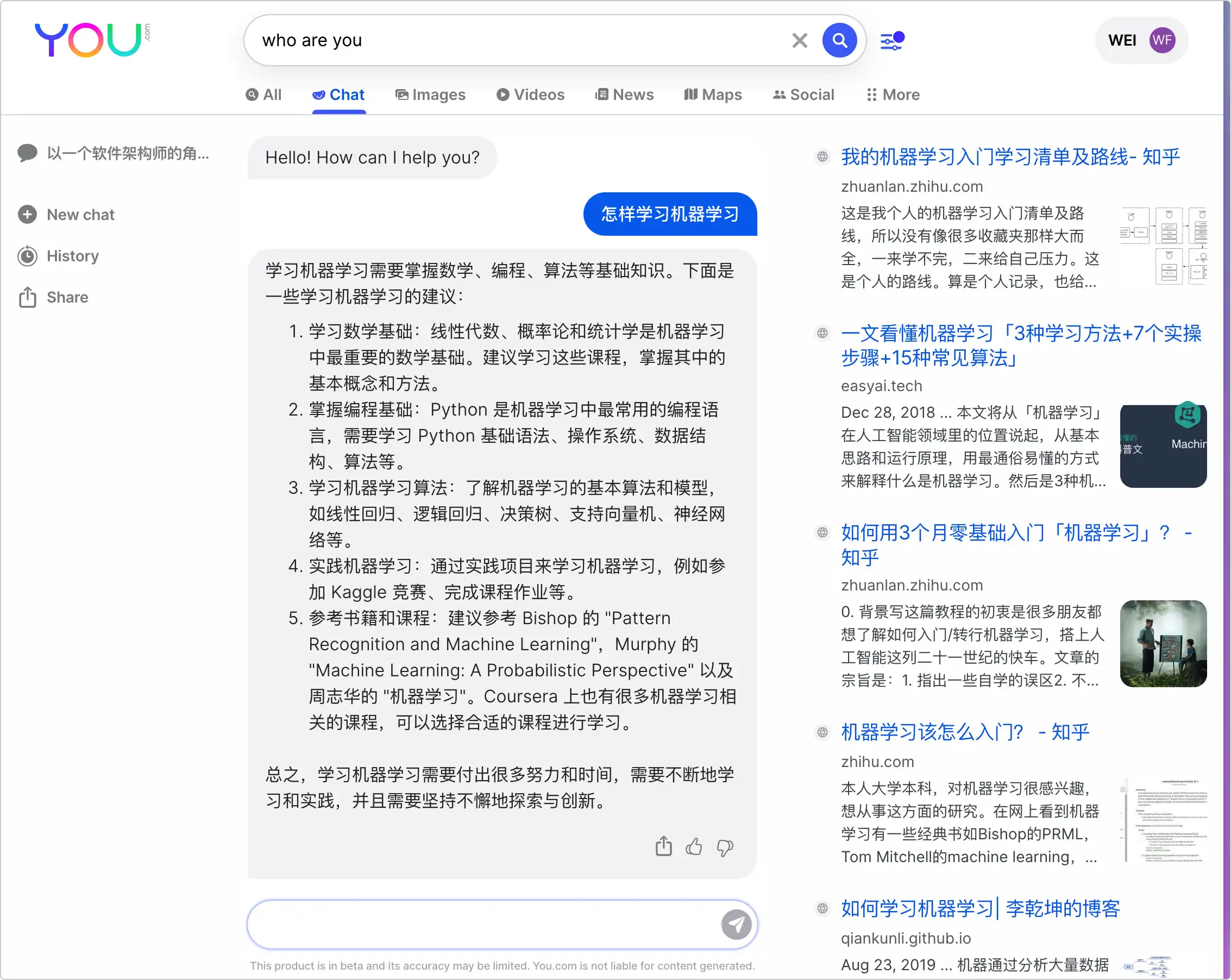 you.com 是一个搜索引擎,Chat 是这款搜索引擎中的一个模块。在 Chat 模块进行搜索,中间区域给给出一个最优答案,右侧也会有通过搜索引擎返回的结果列表。
