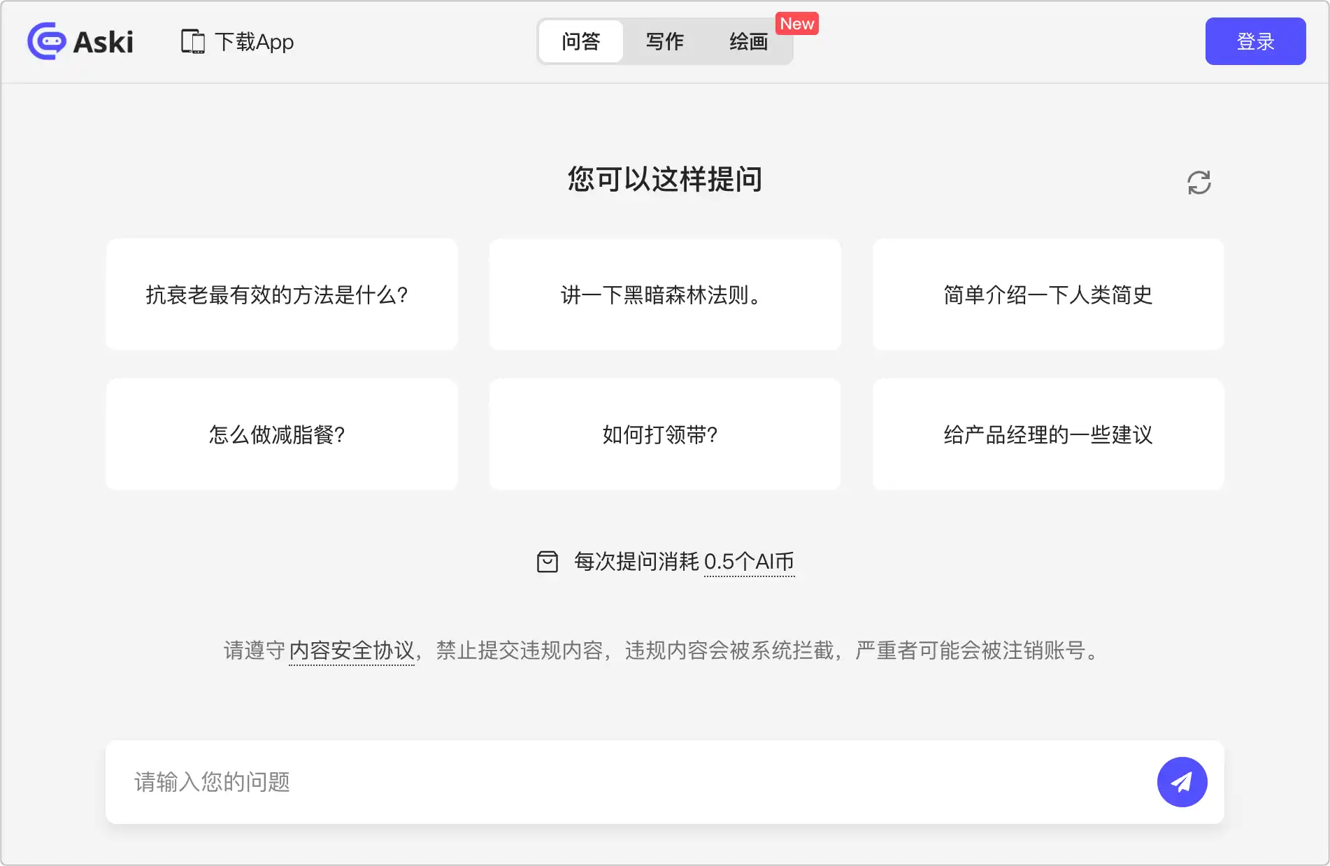 Aski 是一款基于 OpenAI 的 GPT-3 自然语言处理模型的中文 AI 问答服务。回答快速,几乎无延迟。在问答服务之外,Aski 还提供了内容创作服务,支持内容写作、优化,最近又推出了绘画功能。目前,Aski 支持网页端、移动端。
