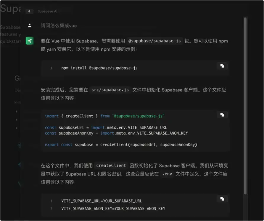 最近看到 Supabase 产品的文档就提供了 AI 问答(https://supabase.com/docs),这个效果就是我想要达到的,总结下就是根据自然语言的输入,给一个精准的答案。