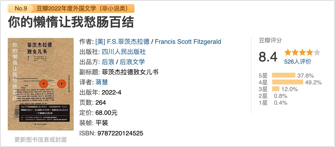 如果你不知道菲茨杰拉德,但一定听过他写的《了不起的盖茨比》。你的懒惰让我愁肠百结是作者在女儿的成长期写给女儿信的合集。