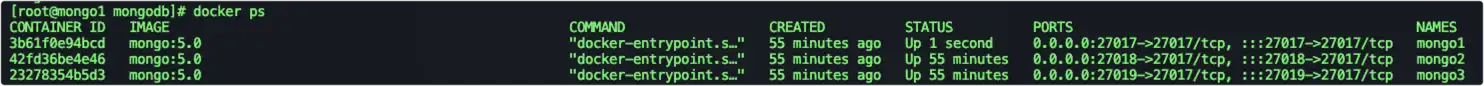 - 该命令初始化一个名为 rs0 的副本集,并将三个 MongoDB 容器添加为成员。