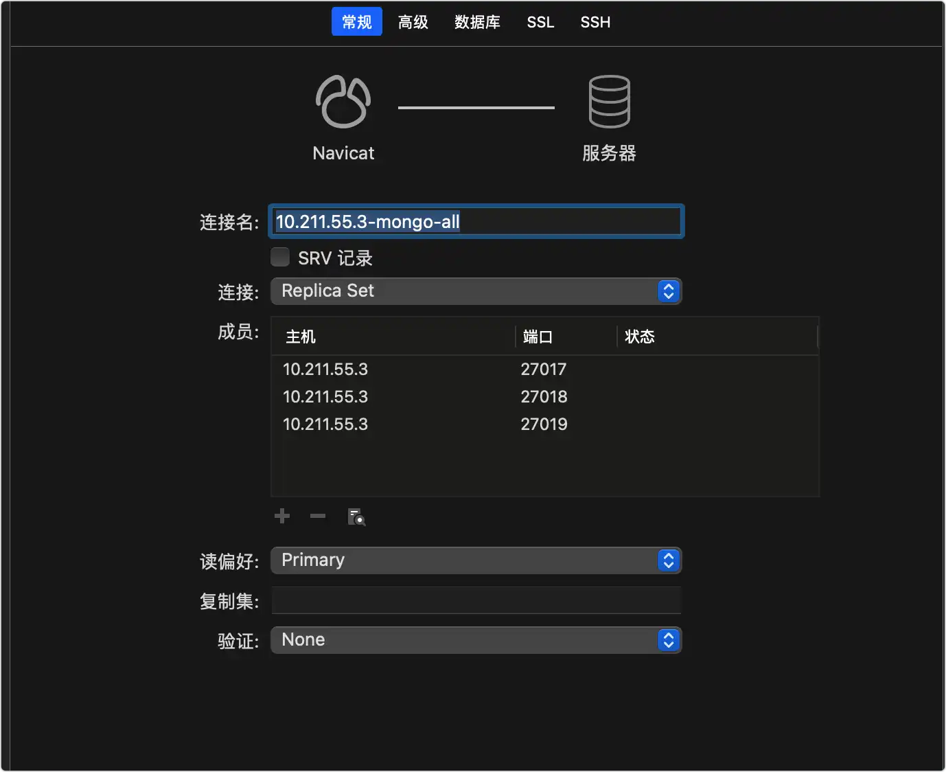 - 注意:host 中指定的 IP 为服务器的 IP,当然如果使用的是容器 IP 或者容器名称,副本集和能正常启动和运行,但程序连接的时候就会出错 。
