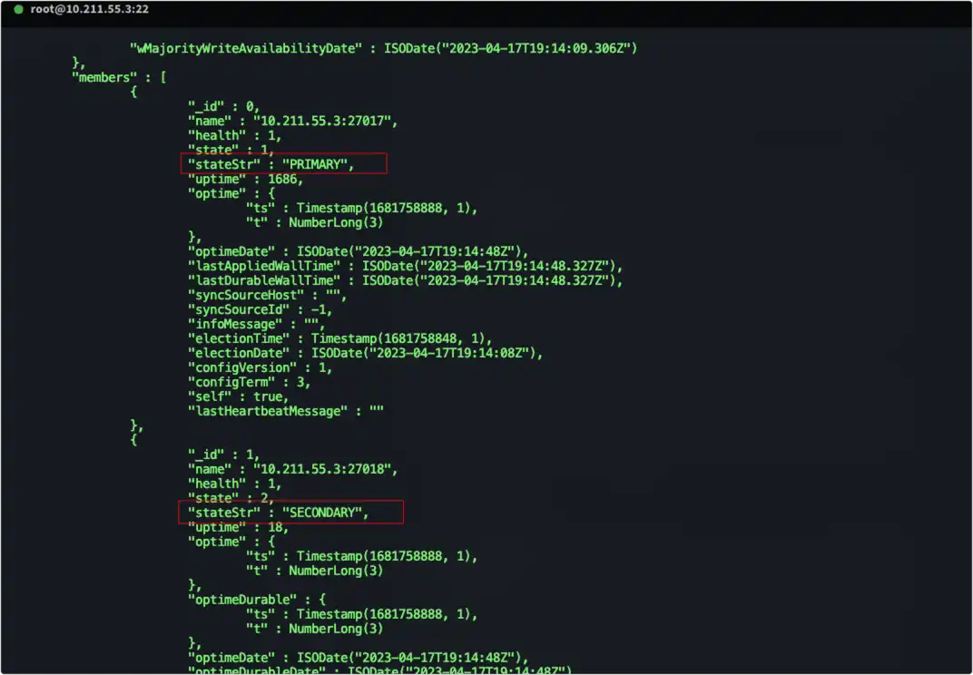 - Mongo1 被指定为了主(Primary),其余两个容器为副本(Secondary)