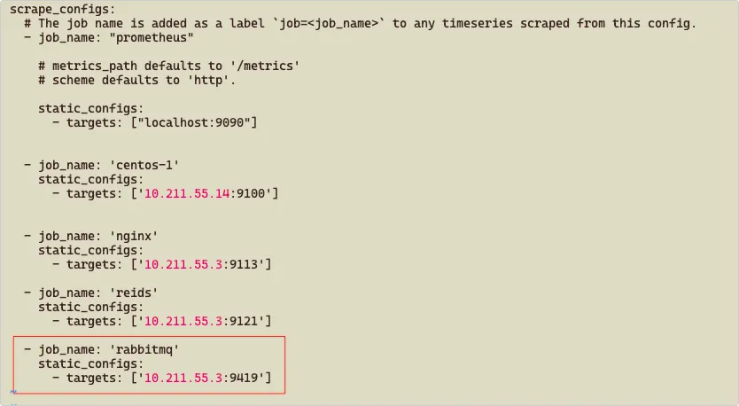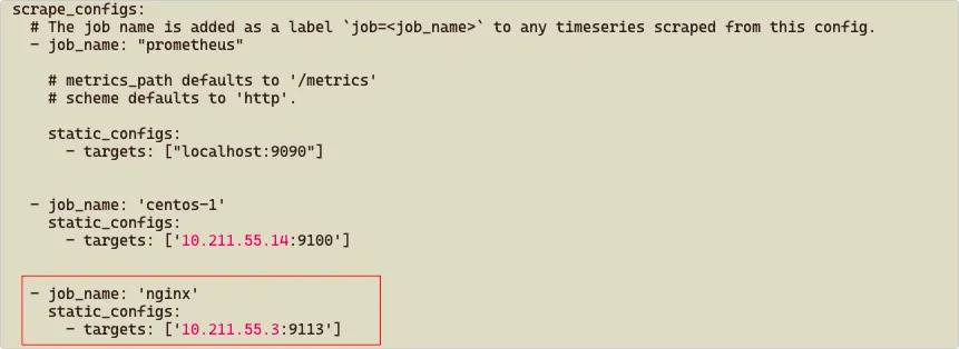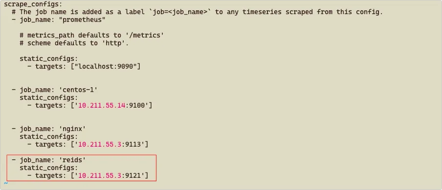 3、在 prometheus 的配置文件中进行绑定,执行vi /usr/local/prometheus/prometheus.yml,在文件的最下面添加 job 配置: