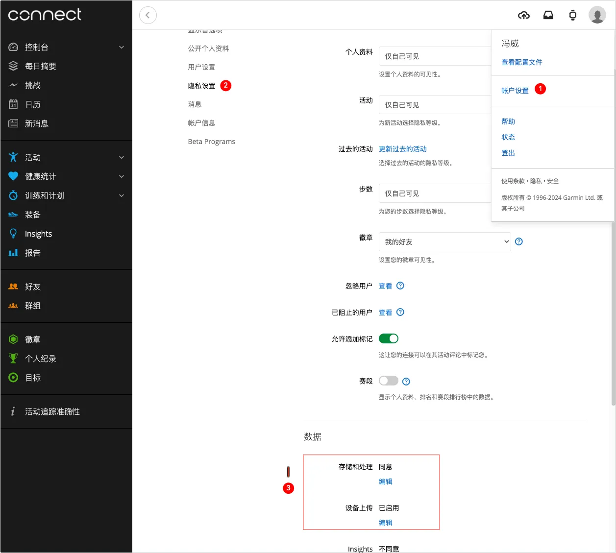 佳明国际区的的账号注册地址是:https://connect.garmin.com/signin/ 。登录后进行如下设置:
