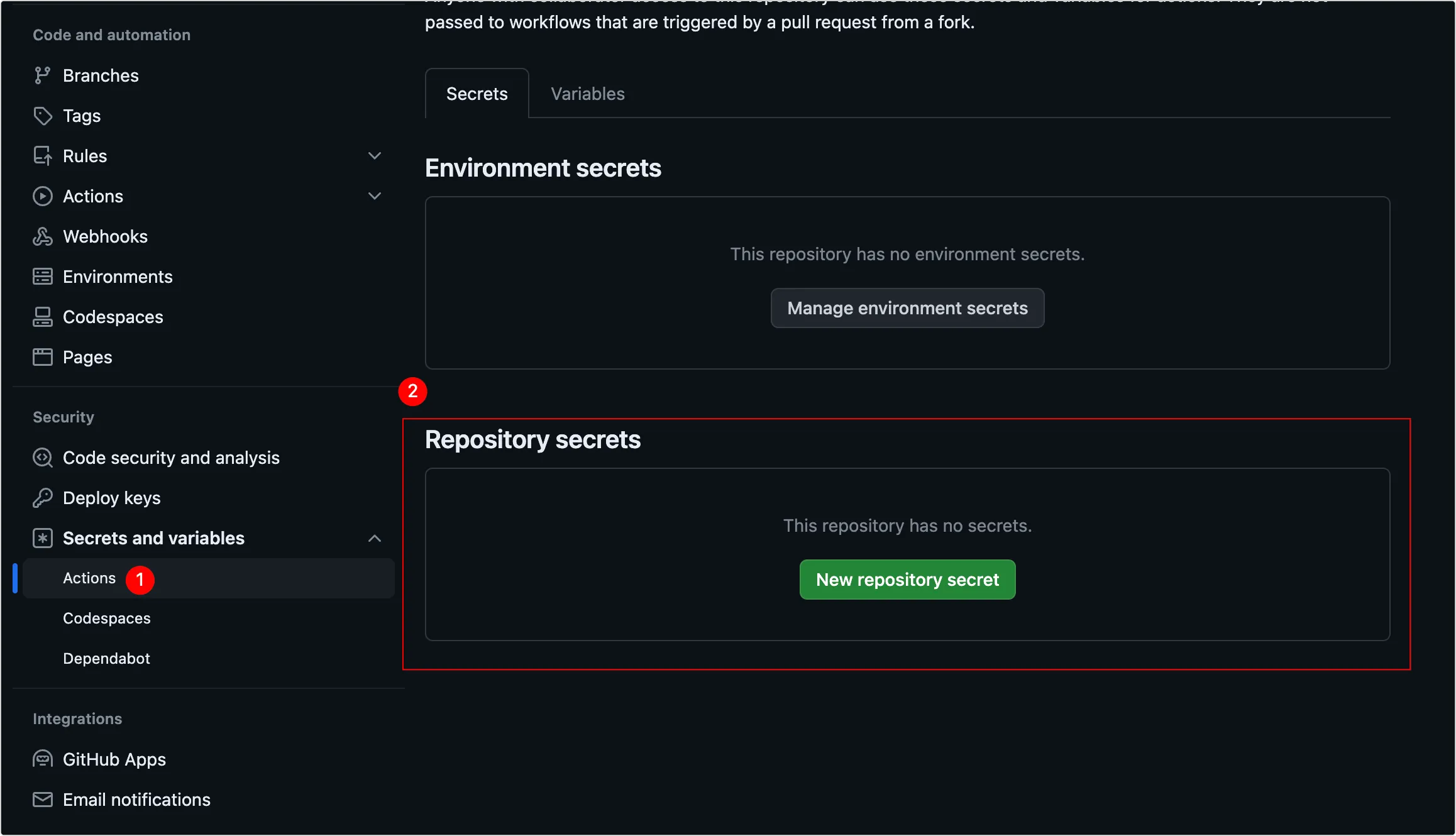 2、点击左侧的 Actions 菜单,在右边的 Repository secrets 中添加环境变量: