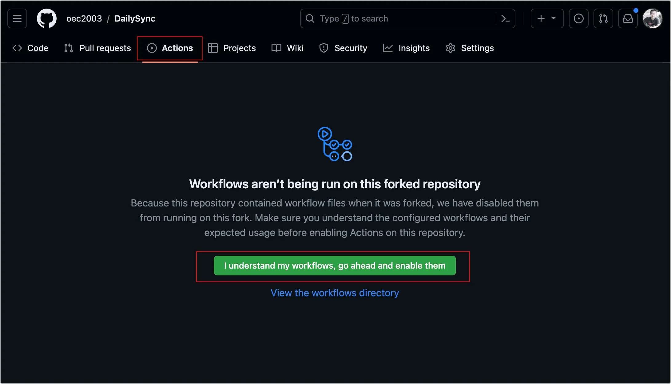 4、切换到 Actions 页签,然后点击绿色按钮启用,如果已经可以看到 workflow 的列表,则忽略此步骤: