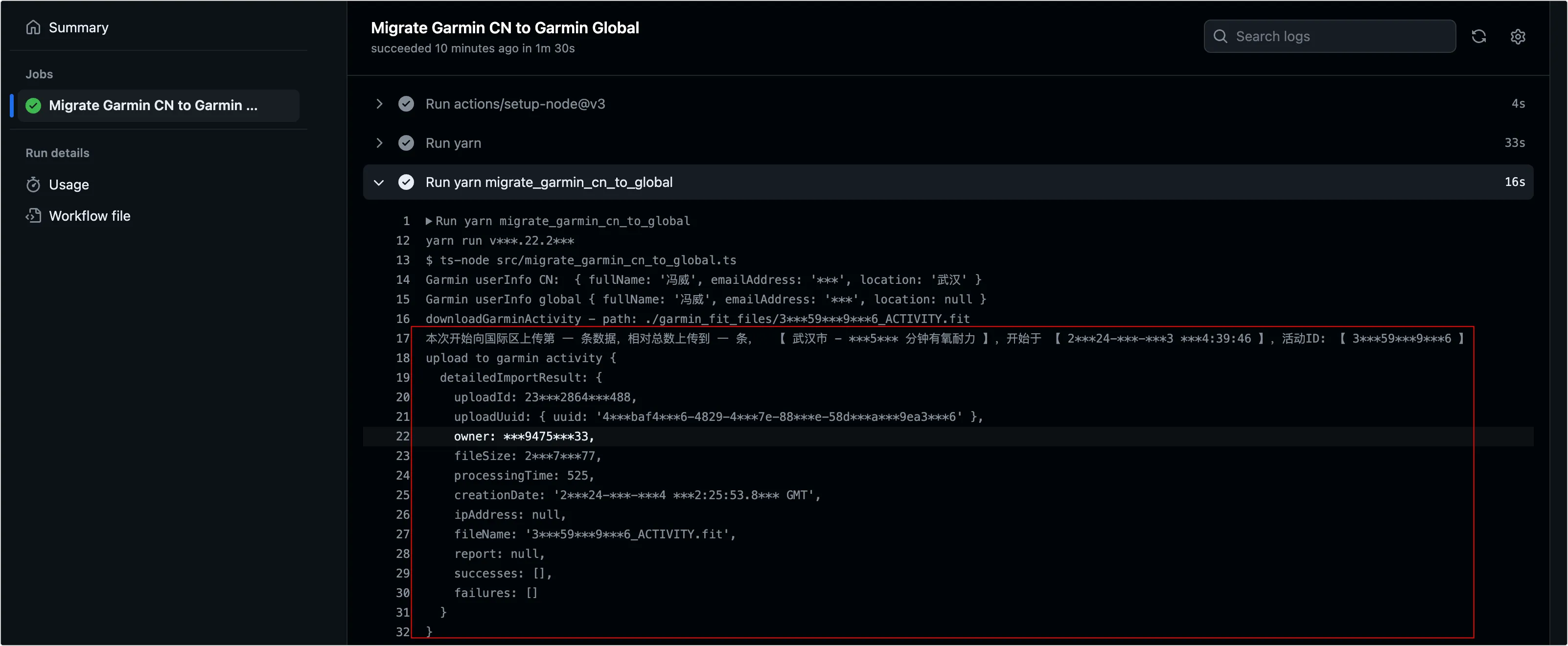 7、点击按钮「Run workflow」进行手动执行。在迁移日志中,如果看到类似这样的日志,说明迁移成功: