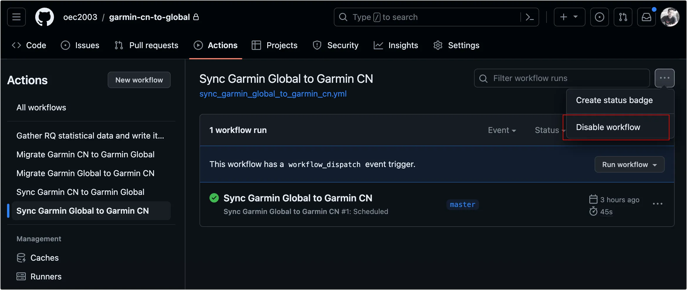 6、当我们点击进入「Migrate Garmin CN to Garmin Global」workflow 时,如果没有发现手动触发的按钮,则需要进行 yml 文件的配置,将下图红框处的代码注释放开: