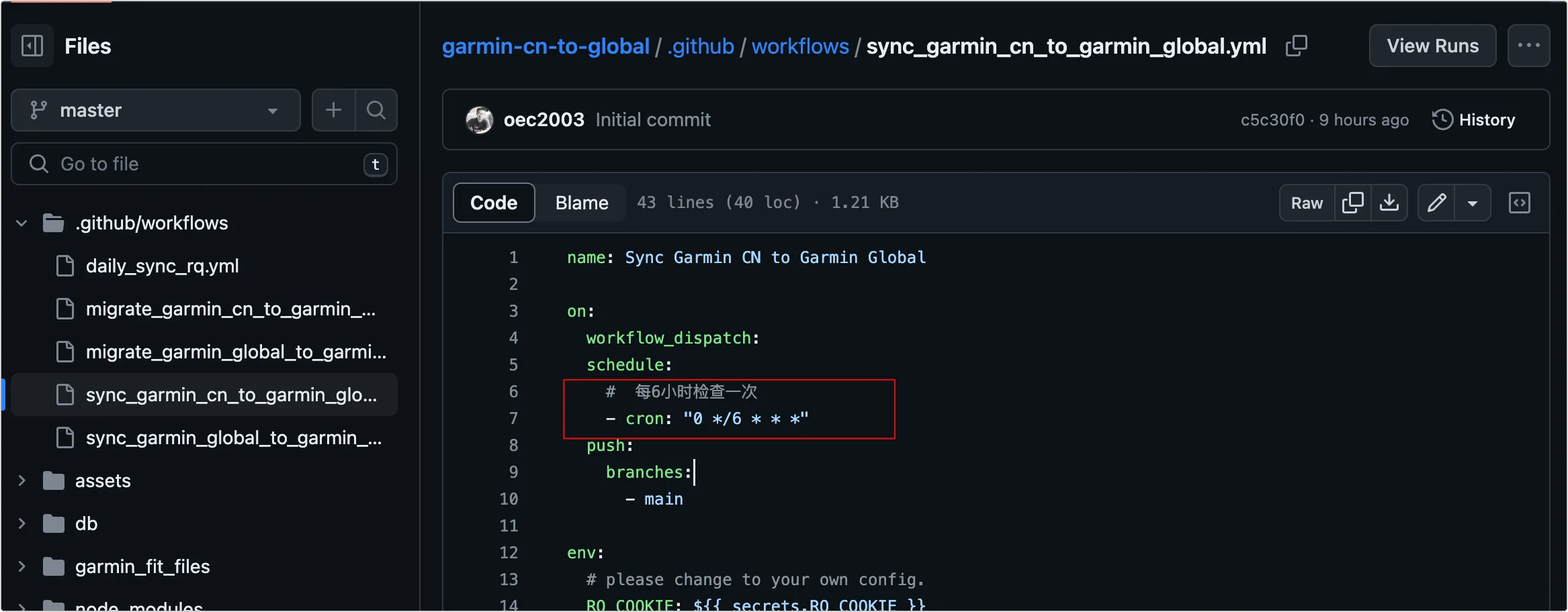 12、上面介绍了手动迁移的 Workflow,自动同步用的是:Sync Garmin CN to Garmin Global ,默认是开启的,每 6 个小时同步一次,如果想要修改同步频率,编辑 yml 文件,修改下图红框部分: