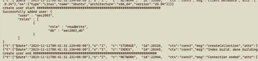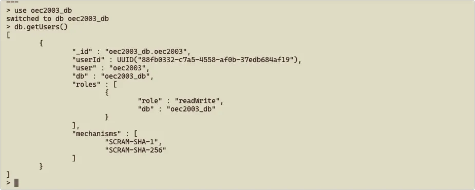 getSiblingDB()是 MongoDB shell 提供的一个方法,它允许你切换到另一个数据库,而不需要重新连接到MongoDB实例。这个方法返回一个新的DB对象,意思是数据库不存在会新创建一个。- db.createCollection(‘oec2003’):在用户创建完成后,创建了一个名为 oec2003 的 collection ,默认创建一个 collection 是为方便测试,因为没有任何内容的库,使用 show dbs 或者客户端连上是看不见新创建的数据库 oec2003_db 。