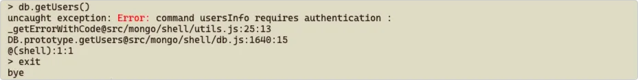 5、进入容器,使用 mongo 进入 MongoDB 的 shell 模式,会发现可以正常进入,但如果执行一些命令会出现没有权限的提示: