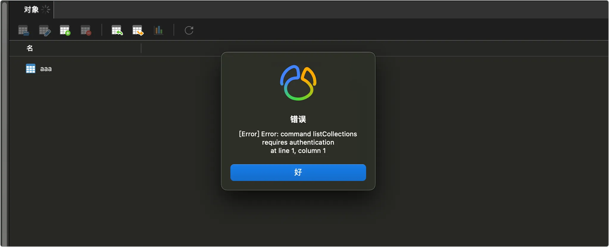 重新构建容器,这时用客户端访问数据库,或者 collection 就会出现如下提示: