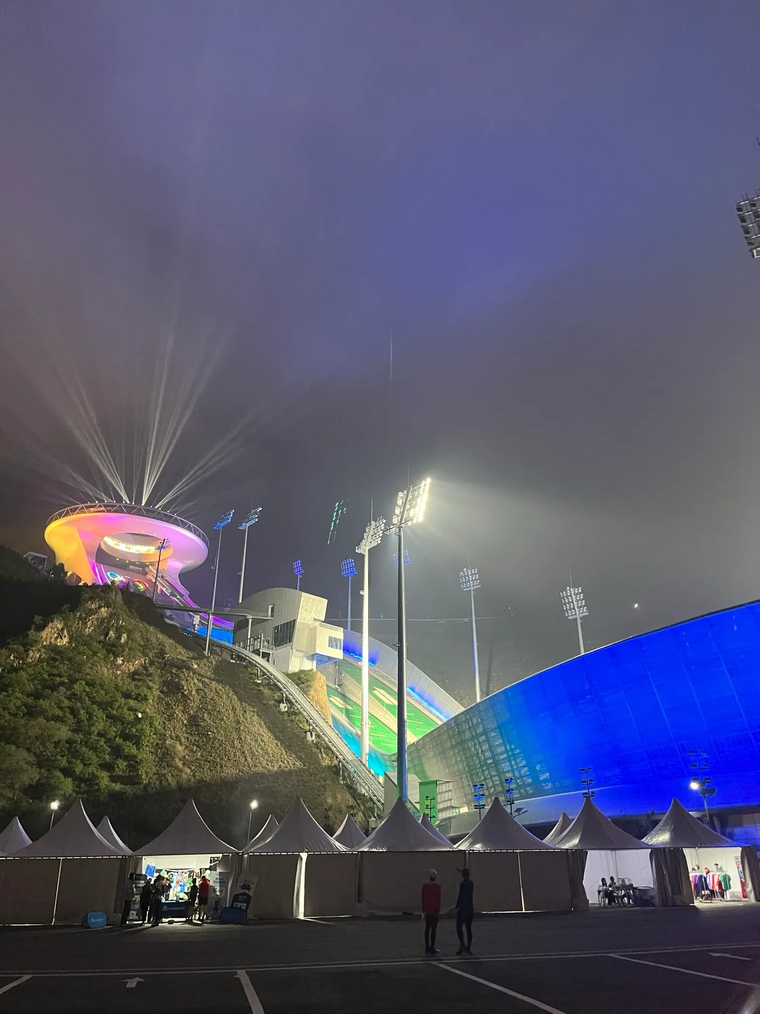 将近 9 点,从酒店出发,去庆典广场坐摆渡车,还和公司跑 ETC 组别的同事叮叮在广场见了个面,最后很幸运赶上了最后一班摆渡车。半个多小时就到了雪如意。