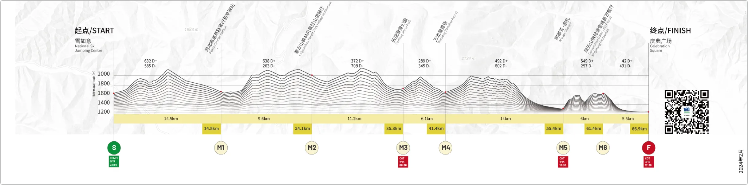 2024 年的赛事进行了进一步的优化和升级,共设置 7 个组别,覆盖从 168 公里的超长距离到 10 公里的短距离,以满足不同跑者的需求。我比较关注的 70 公里组别也做了优化,距离只有 66.9 km,爬升 3000 左右,难度比 23 年有所下降。