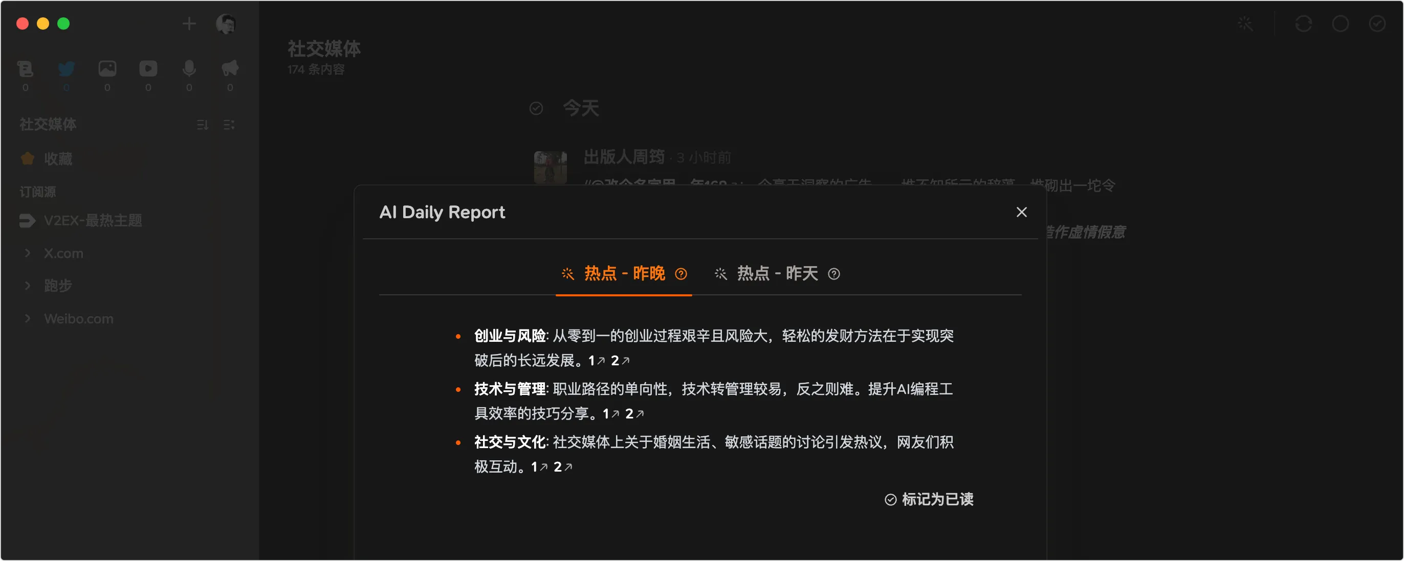 2、AI 赋能:Follow 还引入了 AI 功能,文章和社交媒体页签中可以使用 AI 进行总结,对于订阅数量比较多的用户来说,可以快速了解更新的内容。