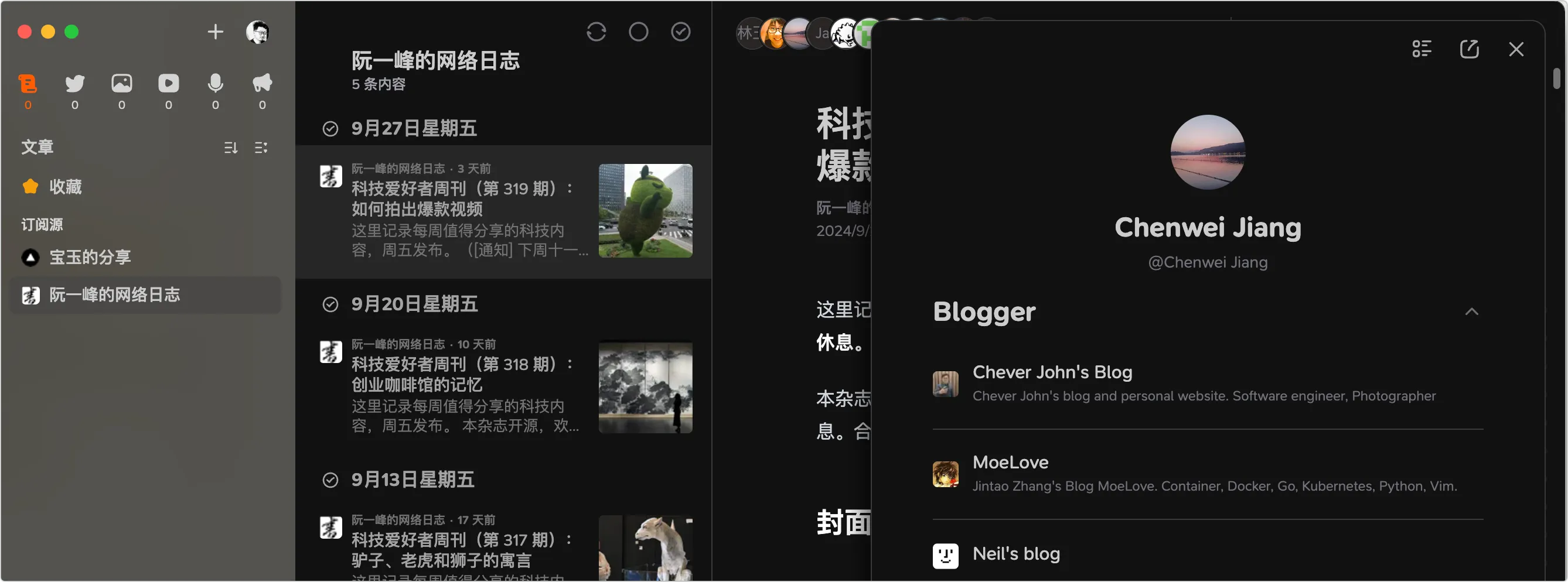 3、社交与互动:Follow 的另一个创新在于其轻社交功能,用户可以查看其他用户的订阅内容,并通过分享和发现建立联系。这种功能使得 RSS 阅读不再孤立,用户之间能够互相发现有趣的订阅源,从而形成社区化的阅读体验。这非常像在博客时代上面挂的外链,通过外链点击进去,又可以发现一些其他感兴趣的博客。