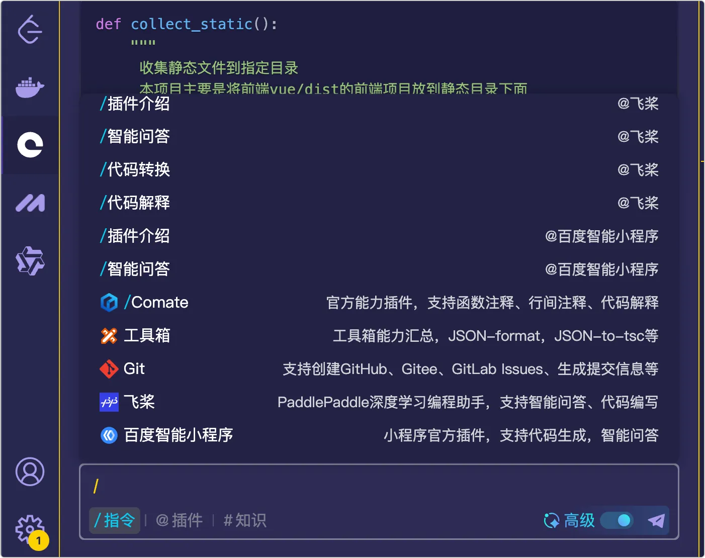 2、都有一个对话框窗口,使用斜杠唤起相关的指令,我对比了下, Comate 的最丰富。
