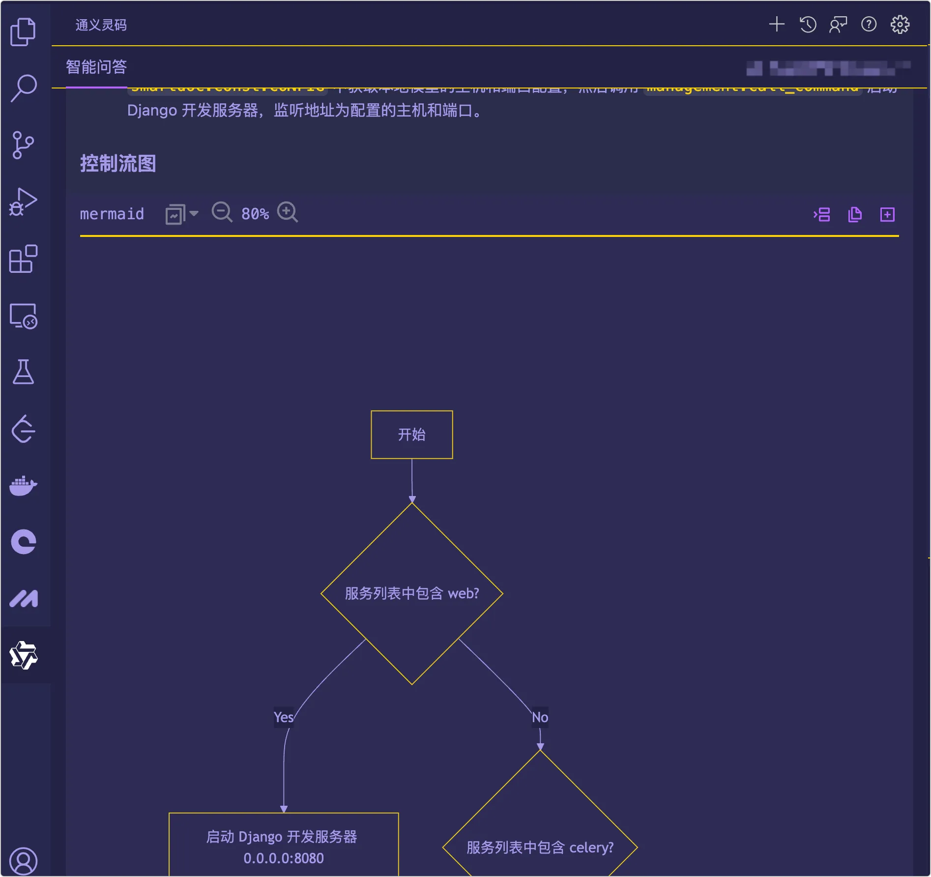 3、在进行代码解释的时候,通义灵码还贴心生成了流程图,对于复杂的业务逻辑,有图的帮助可以更容易理解。