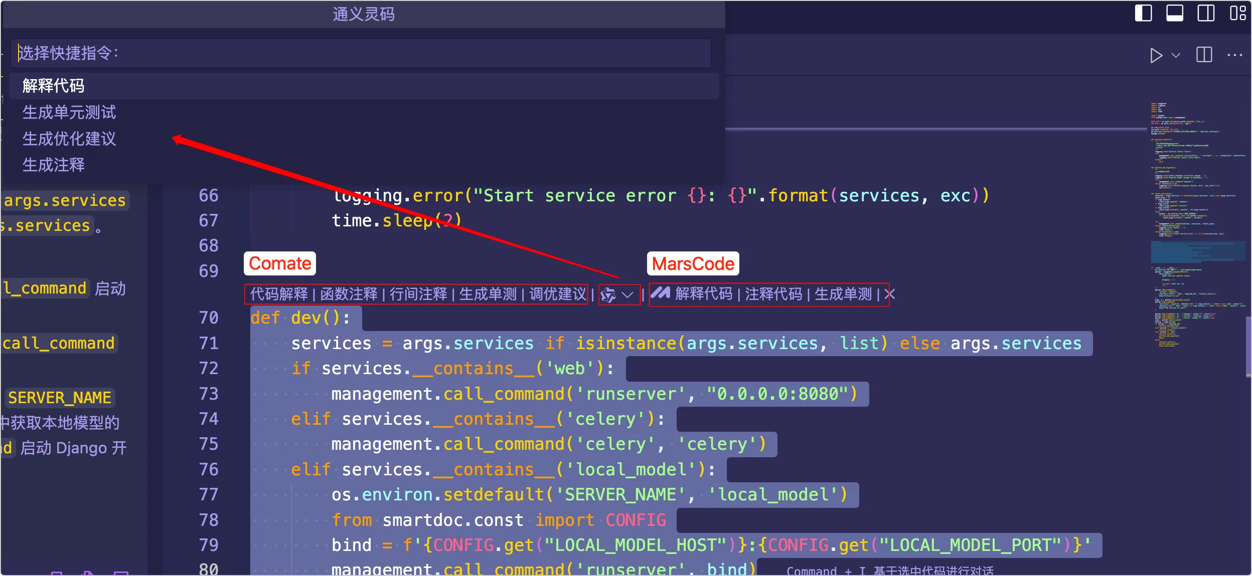 可以看出,代码解释、函数注释、生成单测是三个工具都有,MarsCode 没有优化建议,而 Comate 多了一个行间注释。