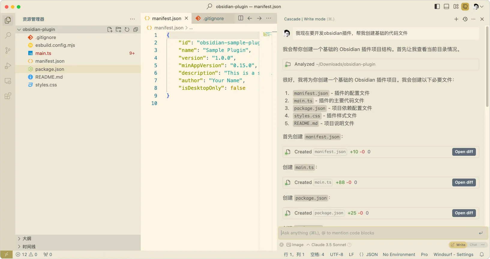 2、遵循一次性对话尽可能只让 AI 完成一件事的原则,我先让生成一个 Obsidian 插件的基础文件,核心逻辑在 main.ts 文件中: