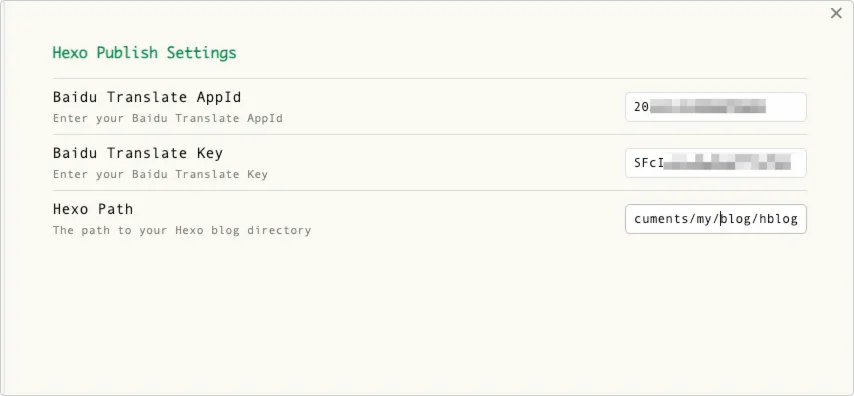 7、因为使用了百度的翻译、又要将文章内容同步到 hexo 中,所以需要在插件的设置中配置相关参数: