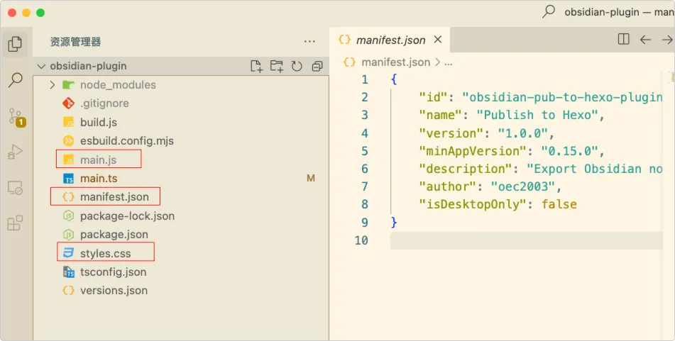 4、代码写完,执行 npm run build 进行构建,构建完成后,会生成一个新的 main.js 文件,Obsidian 插件需要的是包含 main.js 在内的三个文件,如下图: