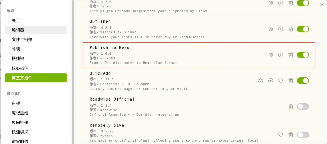 6、首次安装后,在 Obsidian 的第三方插件中就可以看到自己开发的插件了: