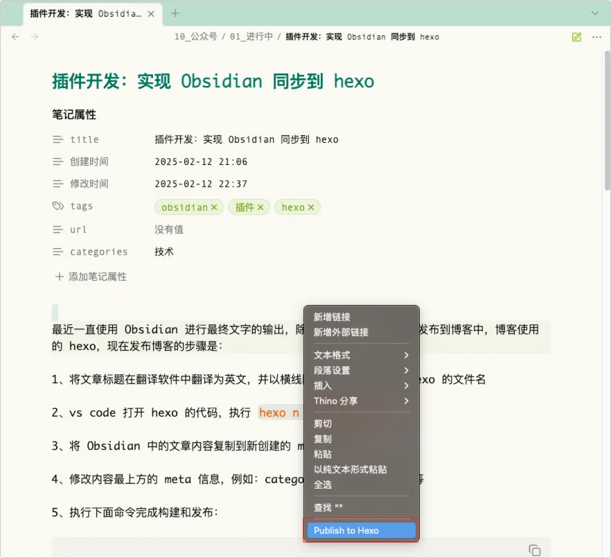 近两年一直使用 Obsidian 进行最终文字的输出,除了发公众号,还会同步发布到博客中,博客使用的 hexo,现在发布博客的步骤是:
