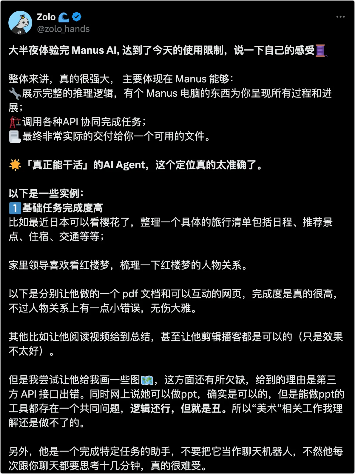 下面这位体验者的感受我觉得是比较客观的。Manus 肯定不是能解决所有问题的神,但至少将大模型和普通用户又拉进了一点。