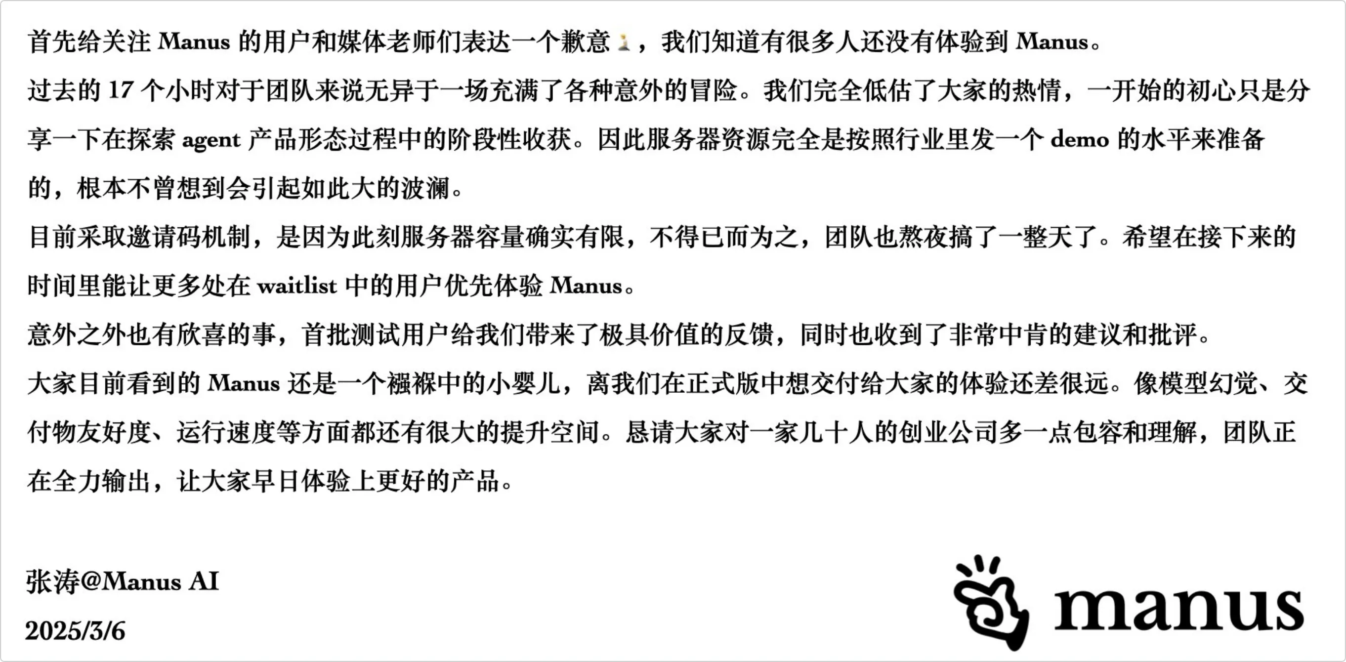7、Manus 团队昨天发布的声明,爆火也是他们意料之外。我觉得如果多给他们一点时间和善意,没准就能出来一个好用的工具。就像肖弘在访谈中说的那样,最想做到就是给世界带来一个好用的工具。
