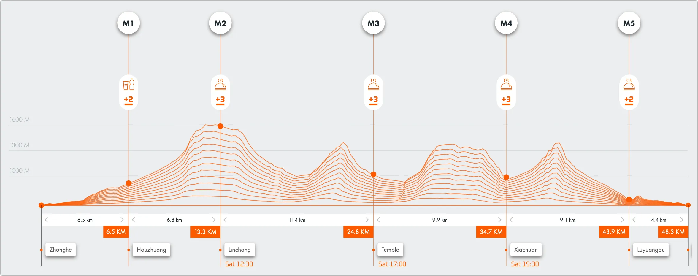 从上面的海拔图来看,这个比赛就翻四座山就可以了,从起点到 CP2 是持续爬升 1000 左右。后面的单看距离和爬升都不算太难。